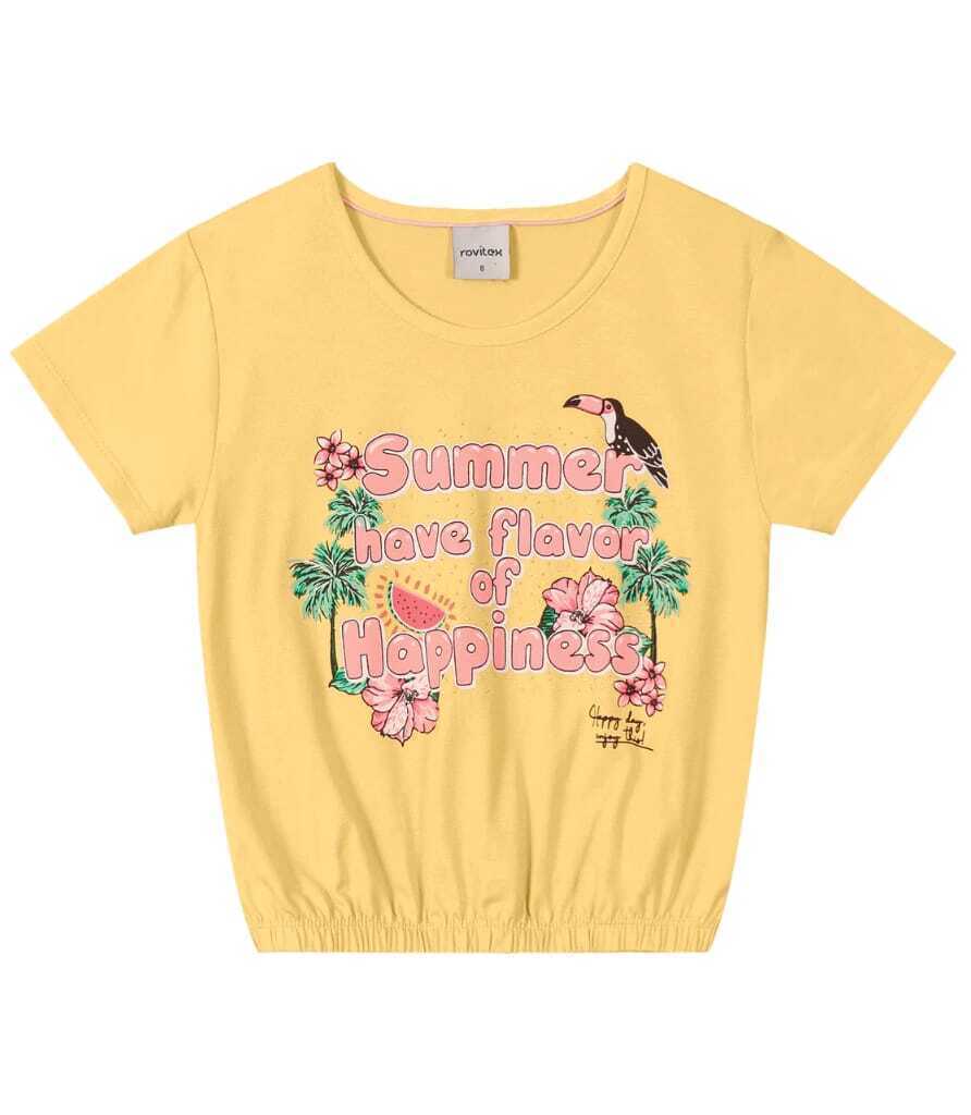 Blusa Infantil Feminina desenvolvida em Malha Visco Premiere. Modelo com mangas curtas, gola redonda e elástico na barra. Possui estampa localizada com aplicação de strass e frase em inglês. Tradução: ""Verão tem gosto de felicidade"". Peça básica e confortável para o dia a dia! Combine com: shorts e sandálias.